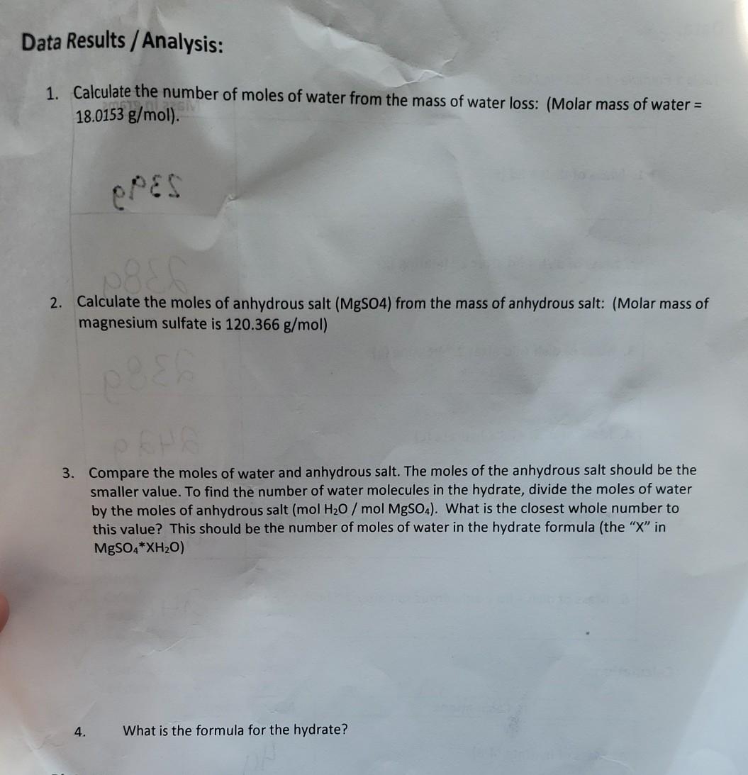 12037gmol Mass g Crucible and lid empty Crucible and lid and hydrated salt Crucible and lid and salt after 1st heating 331178 336256 335667 Crucible and lid and salt after and heating 334813 Crucible and lid and salt after 3rd heating 33. - Why do you think it is necessary to heat the evaporating dish before finding its mass-What is the percent of water in MgSO4 7H2O Explain what effects the following errors would have on the value for the percent water in the hydrate. An anhydrate is a hydrate that has lost its water molecules.